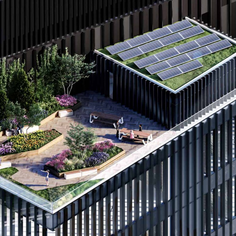 Soft planting, green and brown roofs are implemented to aid biodiversity, to assist in improving air quality and to enhance the urban greening factor in an otherwise industrial site deprived of natural elements. Rainwater is harvested to facilitate irrigation and reduce water consumption.